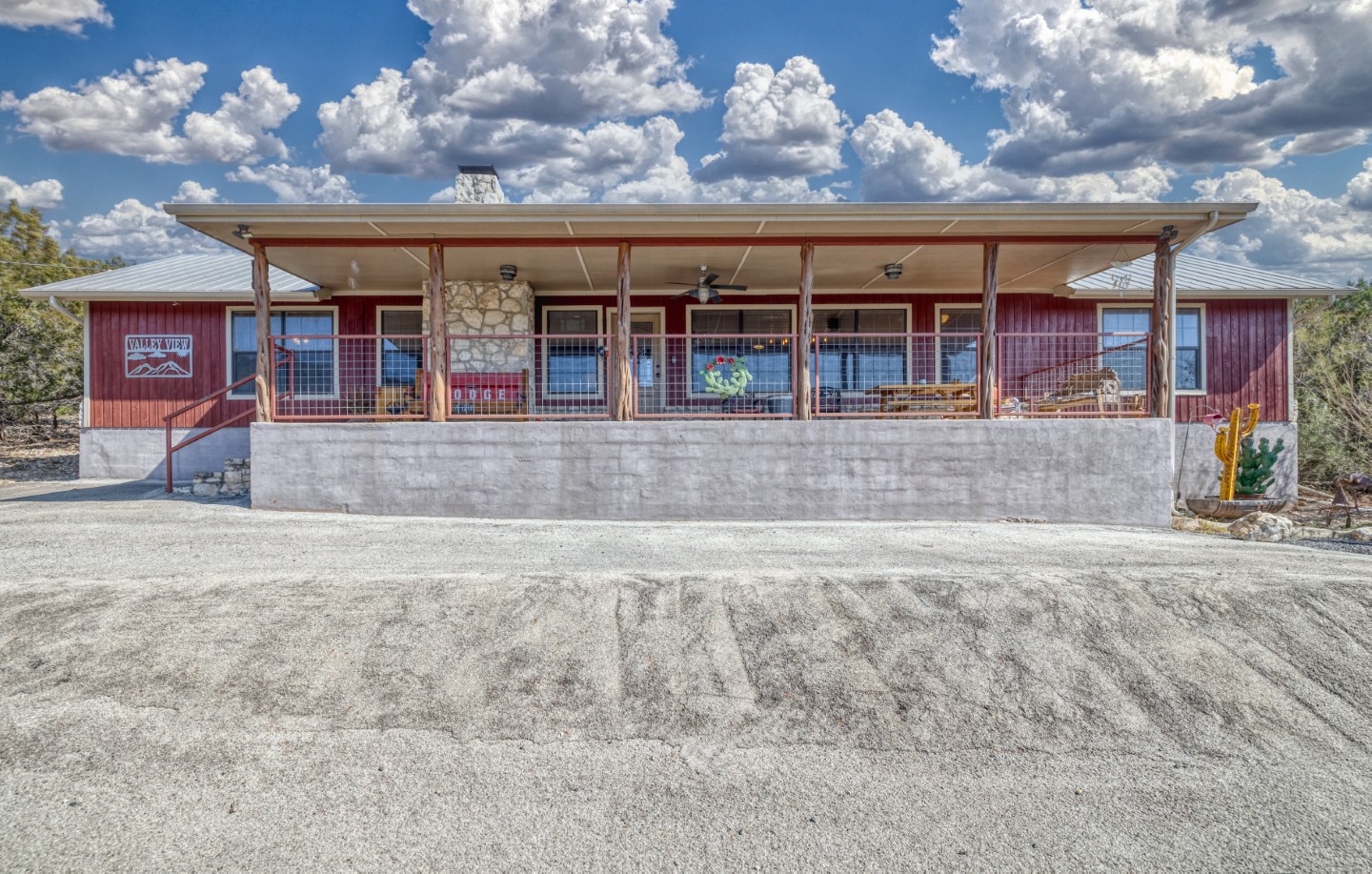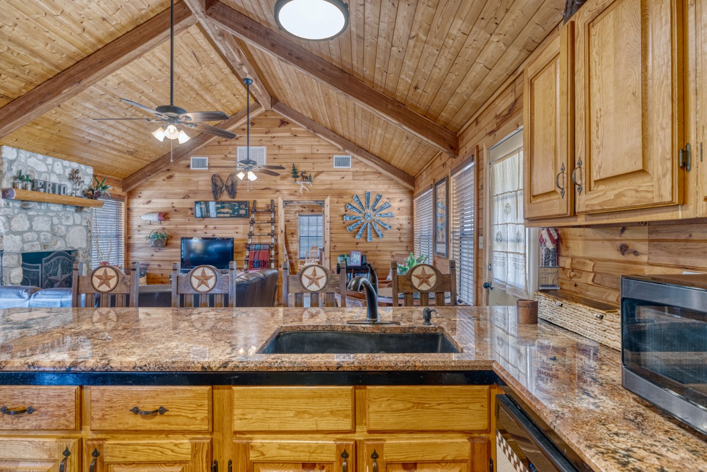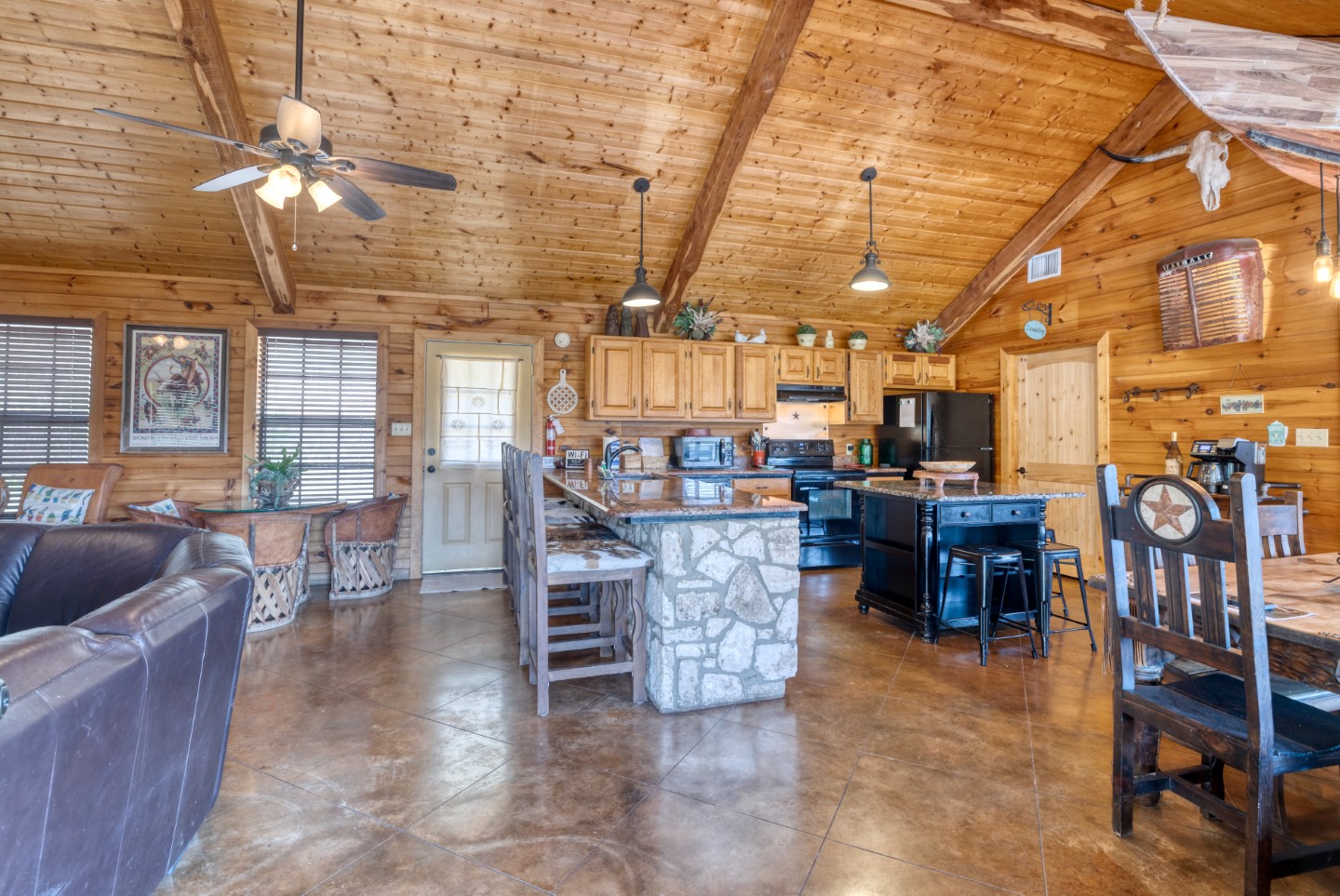 PROPERTY #008 - Aptly named Valley View, this 2BR/2B charmer is situated in the heart of Concan Texas with sweeping views of hills across a tree studded valley. Currently in the rental pool in a very lucrative area, the home will sleep 12 people comfortably. Owners will have access to a stretch along the Frio River with complex rock work overlooking the crystal, clear water, near the popular Kenneth Arthur crossing. The home is well appointed with unique lighting in all rooms and comes furnished. Distinct touches throughout the home make it heads above most rentals. There are granite countertops in the kitchen and bathrooms, beautiful, rich wood paneling for that cozy cabin feel, and a rock fireplace. The two bathrooms have large, spa like showers and both bedrooms have walk in closets. There is an oversized utility room off the kitchen and a covered front porch running the length of the home with your valley views. Also included is a BBQ area and a separate firepit area for those sweet hill country evenings we all love. Plenty of paved parking and a nice sized metal outbuilding to store all your river gear. The property is zero scaped for low maintenance enabling you to enjoy more time on the Frio!
