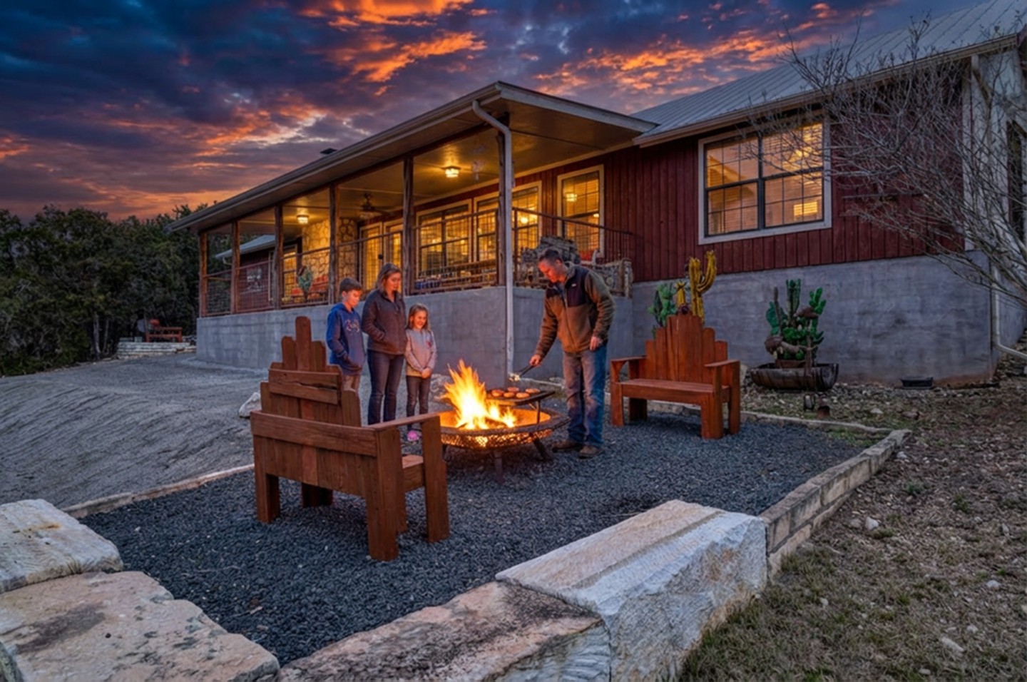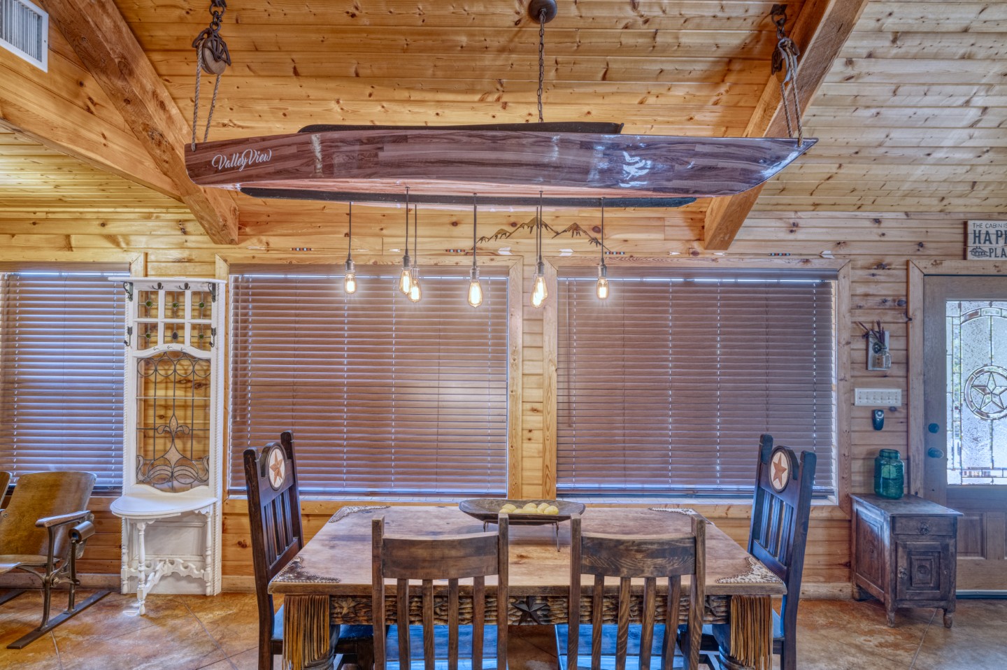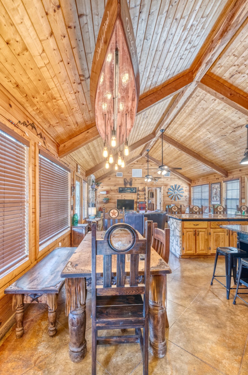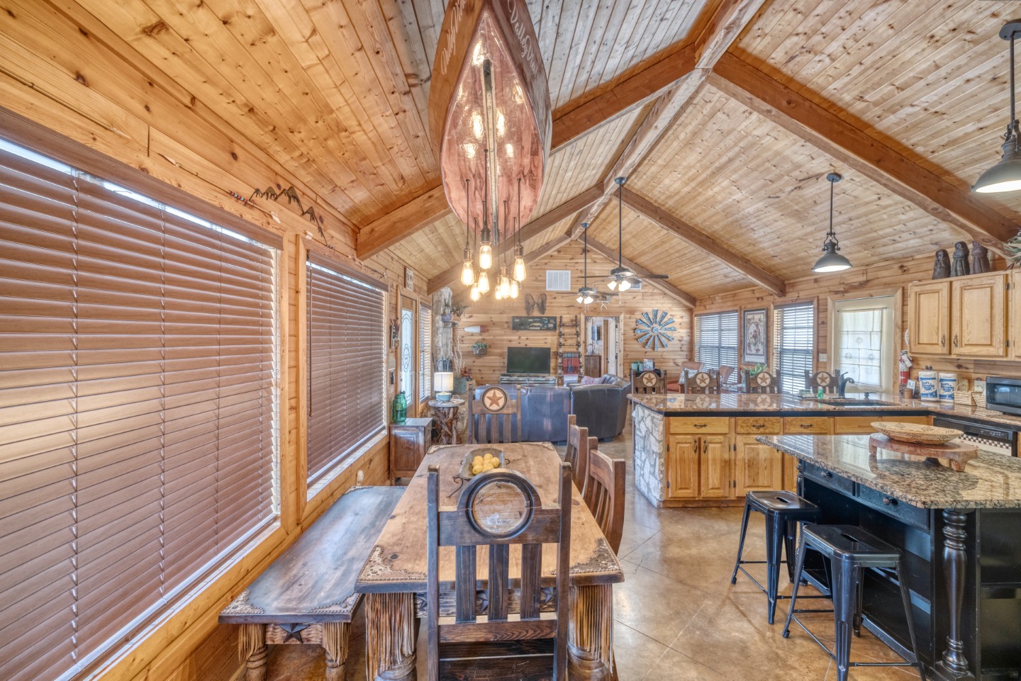 PROPERTY #008 - Aptly named Valley View, this 2BR/2B charmer is situated in the heart of Concan Texas with sweeping views of hills across a tree studded valley. Currently in the rental pool in a very lucrative area, the home will sleep 12 people comfortably. Owners will have access to a stretch along the Frio River with complex rock work overlooking the crystal, clear water, near the popular Kenneth Arthur crossing. The home is well appointed with unique lighting in all rooms and comes furnished. Distinct touches throughout the home make it heads above most rentals. There are granite countertops in the kitchen and bathrooms, beautiful, rich wood paneling for that cozy cabin feel, and a rock fireplace. The two bathrooms have large, spa like showers and both bedrooms have walk in closets. There is an oversized utility room off the kitchen and a covered front porch running the length of the home with your valley views. Also included is a BBQ area and a separate firepit area for those sweet hill country evenings we all love. Plenty of paved parking and a nice sized metal outbuilding to store all your river gear. The property is zero scaped for low maintenance enabling you to enjoy more time on the Frio!