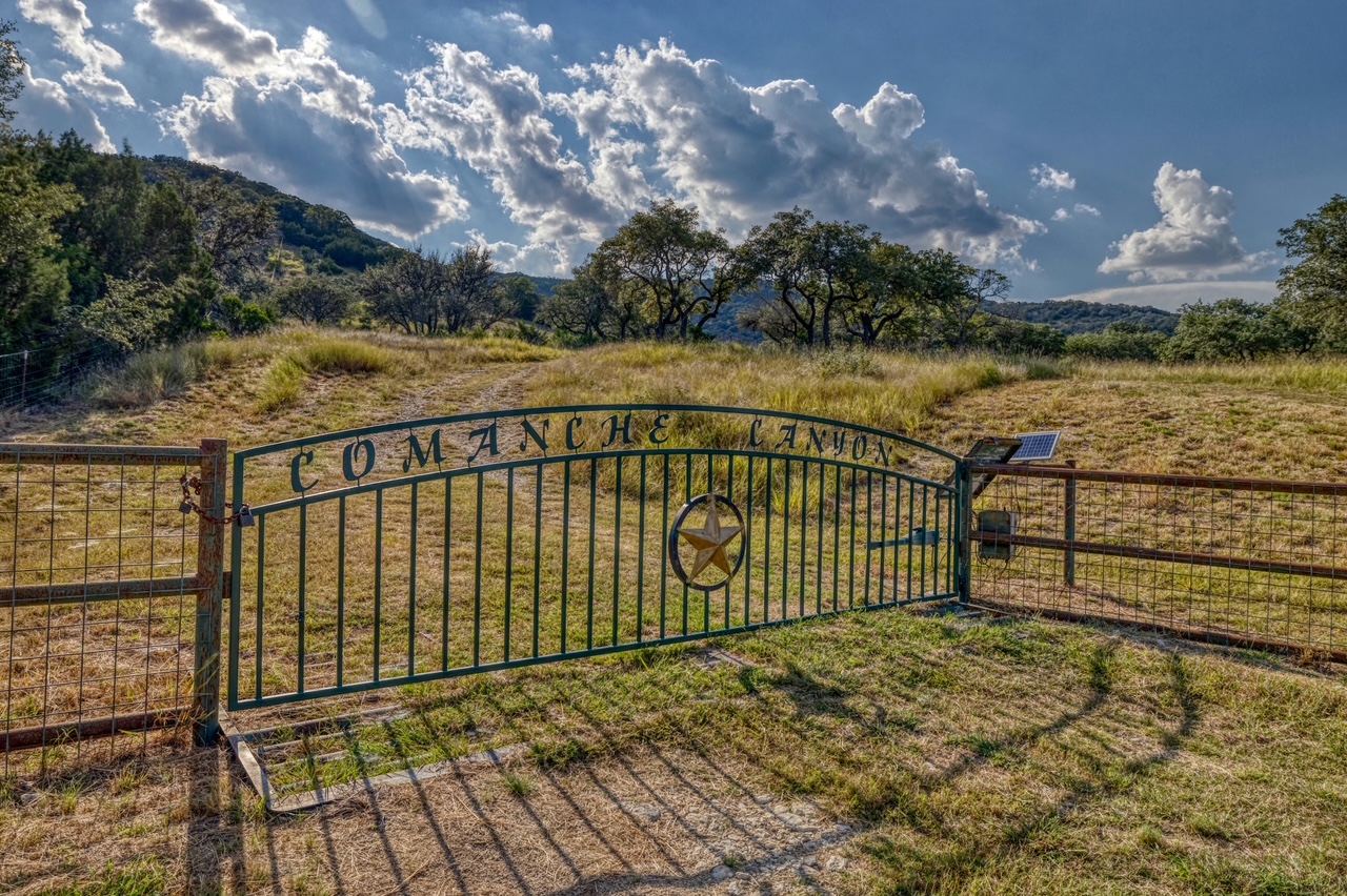 PROPERTY #010 - Comanche Canyon Ranch is located 2.8 miles from Leakey proper and is a 7 minute scenic drive into town. As you enter the 225.71 acre ranch, Cedar Hollow Creek forms the SE corner and has been dammed to create a serene estuary, fringed with Sycamore and Cypress trees. Driving into the ranch you will be taken with the chain of hills that form the north and west boundaries and the Oak studded, rolling valley below, including a 5 acre high fenced pen. A cave is located above the home in the center of the ranch. There are two box canyons, one having two permanent springs that feed a sizable pond providing year round water for the abundant wildlife on the ranch. Aoudad, White Tail, Axis, hogs and even a herd of Sambar call the ranch home. An ATV trail ascends 2200 ft. to the top and it traverses the ridge in both directions. The beautifully appointed 3BR/2B home is elevated for breathtaking, long views to the south and east. The inviting porch wraps around two sides to take in the views and there are two courtyards front and back with one having a firepit and attractive land-scaping in both. The front porch is screened and the home comes tastefully furnished with Western artwork and design. There is a large carport as well. Below the home is a guest cabin with covered front porch, screened porch, kitchenette, Murphy bed, loft and full bath with its own large firepit area. The 30X50 insulated metal barn houses a Kubota tractor with shredder and riding lawnmower that conveys and room for your own side by side and other toys. Inside the barn is a rustic elegant guest quarter with reclaimed wood walls, tall ceiling and full bath along with an upstairs bedroom all under heat and air. The high-yielding well is housed along with two 5000 gallon storage tanks and all buildings on the ranch have been guttered and set up for potential rain water harvesting. There is an impressive cleaning station, two penned 1000 lb. corn feeders which double as hog traps, large blinds, along with an RV hookup. This turnkey property is perfect for a family hunting or recreational ranch, but with a word of warning, you will want to make it your permanent home!
