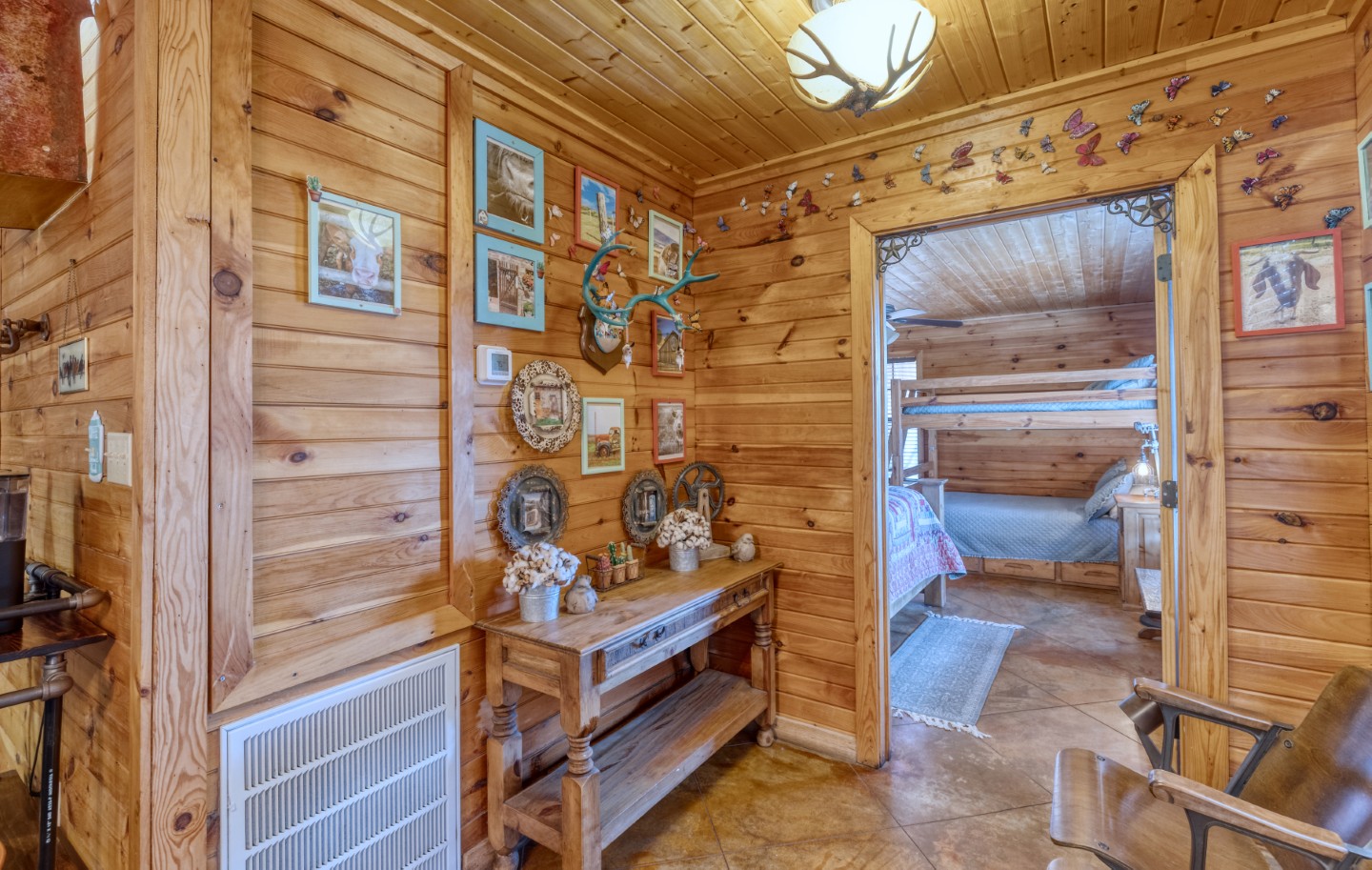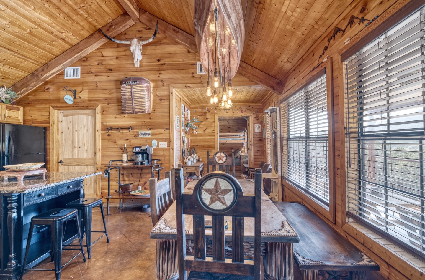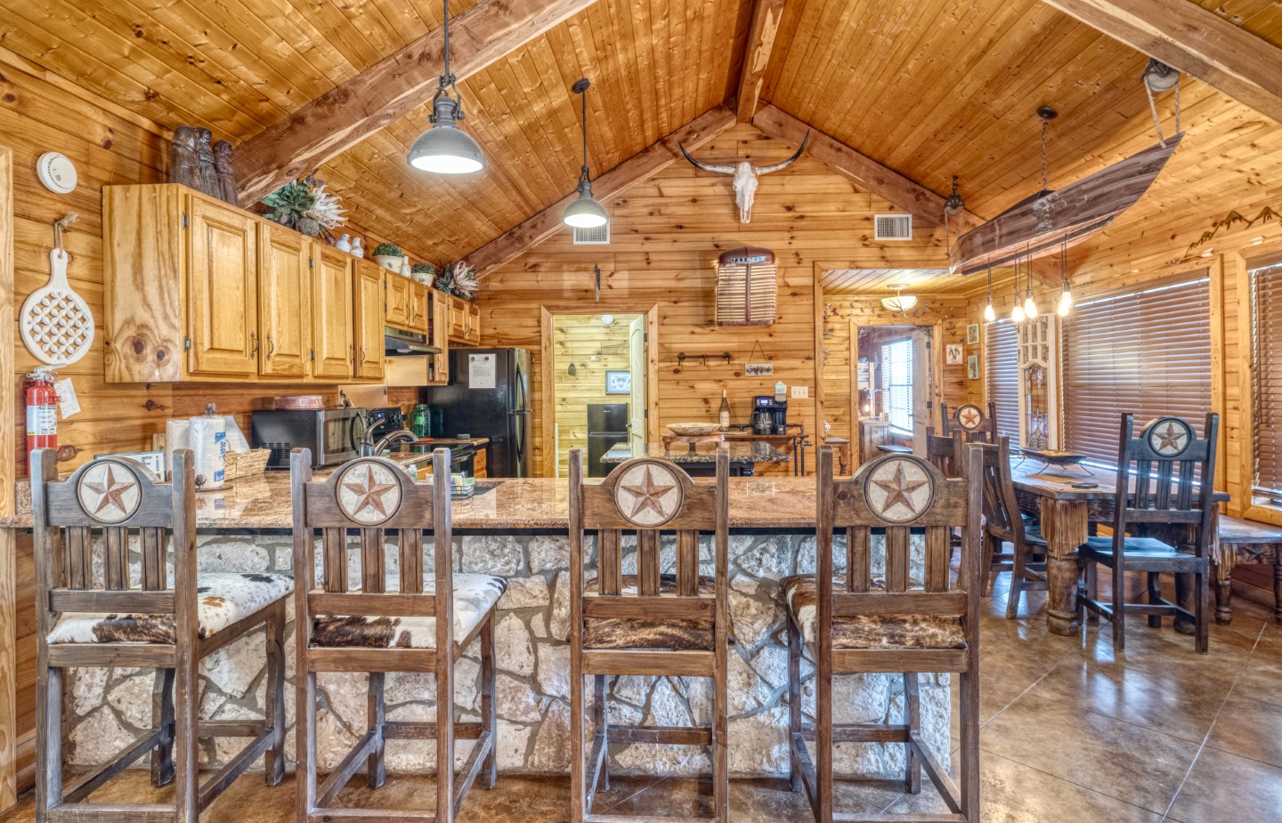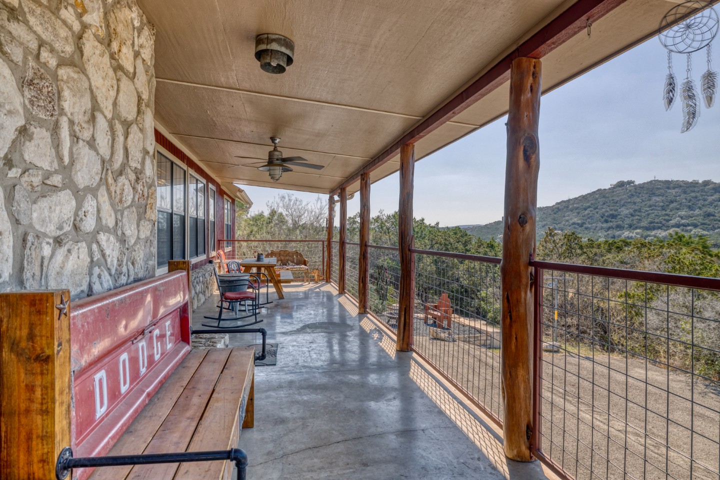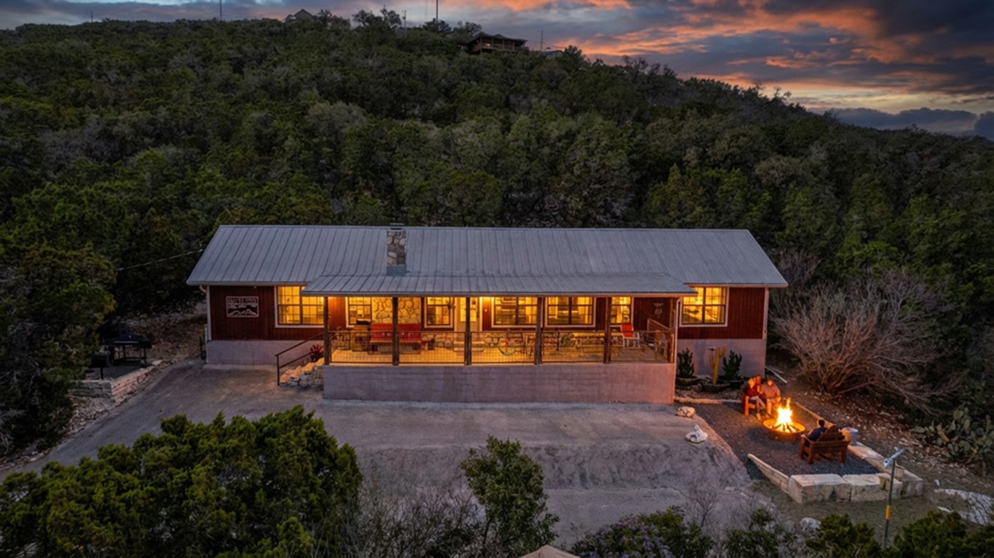 PROPERTY #008 - Aptly named Valley View, this 2BR/2B charmer is situated in the heart of Concan Texas with sweeping views of hills across a tree studded valley. Currently in the rental pool in a very lucrative area, the home will sleep 12 people comfortably. Owners will have access to a stretch along the Frio River with complex rock work overlooking the crystal, clear water, near the popular Kenneth Arthur crossing. The home is well appointed with unique lighting in all rooms and comes furnished. Distinct touches throughout the home make it heads above most rentals. There are granite countertops in the kitchen and bathrooms, beautiful, rich wood paneling for that cozy cabin feel, and a rock fireplace. The two bathrooms have large, spa like showers and both bedrooms have walk in closets. There is an oversized utility room off the kitchen and a covered front porch running the length of the home with your valley views. Also included is a BBQ area and a separate firepit area for those sweet hill country evenings we all love. Plenty of paved parking and a nice sized metal outbuilding to store all your river gear. The property is zero scaped for low maintenance enabling you to enjoy more time on the Frio!